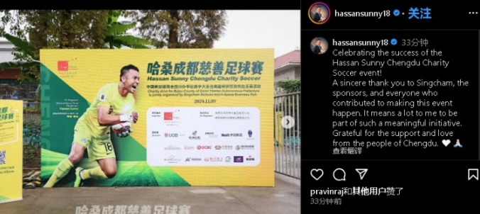 11 月 10 日讯,体育的意义从来不局限于赛场的胜负,它还能传递爱与温暖。前新加坡国门哈桑的最新动态就是一个生动的例子。哈桑在社媒上分享了自己在成都参加慈善足球赛的画面,引起了不少球迷的关注。